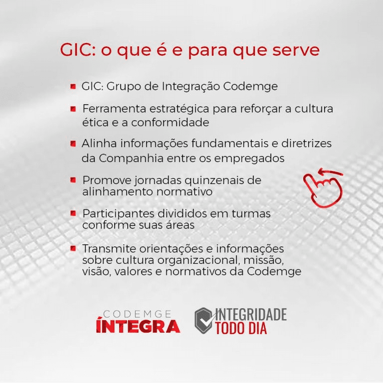Nesta quarta matéria da série “Integridade todo dia”, a Gerência de Integridade, Conformidade e Gestão de Riscos (Gicor) destaca a importância do Grupo de Integração Codemge (GIC) para levar ao conhecimento de todos os empregados alguns dos principais normativos da Empresa.